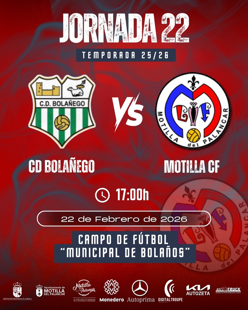 Tras el parón liguero, el Motilla CF volverá a la competición fuera de casa el domingo 22 de febrero, con visita al CD Bolañego. El encuentro se disputará a las 17:00 horas en el Campo de Fútbol Municipal de Bolaños.