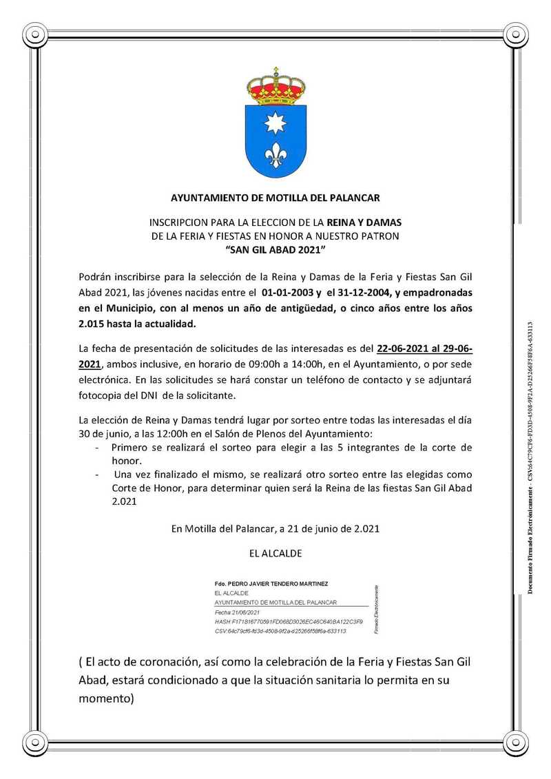 Las jóvenes nacidas entre el 01-01-2003 y el 31-12-2004 y empadronadas en el Municipio, podrán inscribirse para la selección de la Reina y Damas de la Feria y Fiestas San Gil Abad 2021 hasta el 29-06-2021 en el Ayuntamiento de Motilla del Palancar o por sede electrónica.