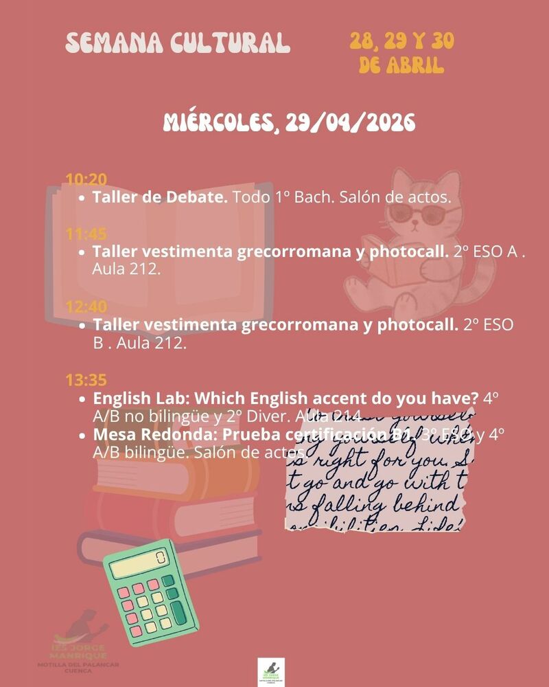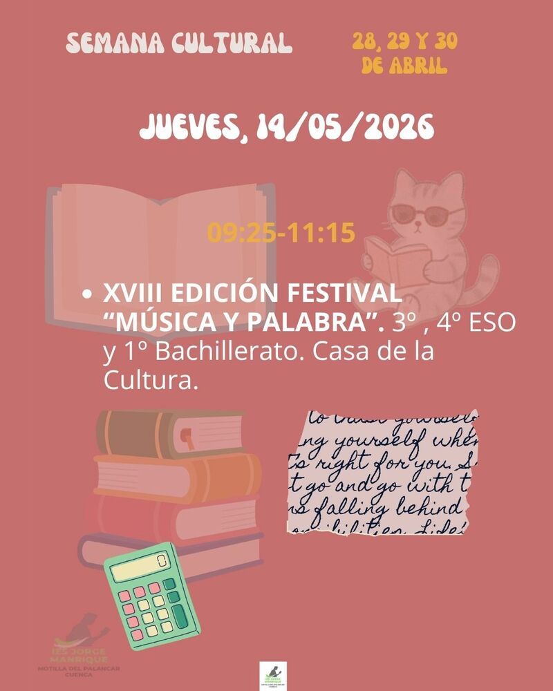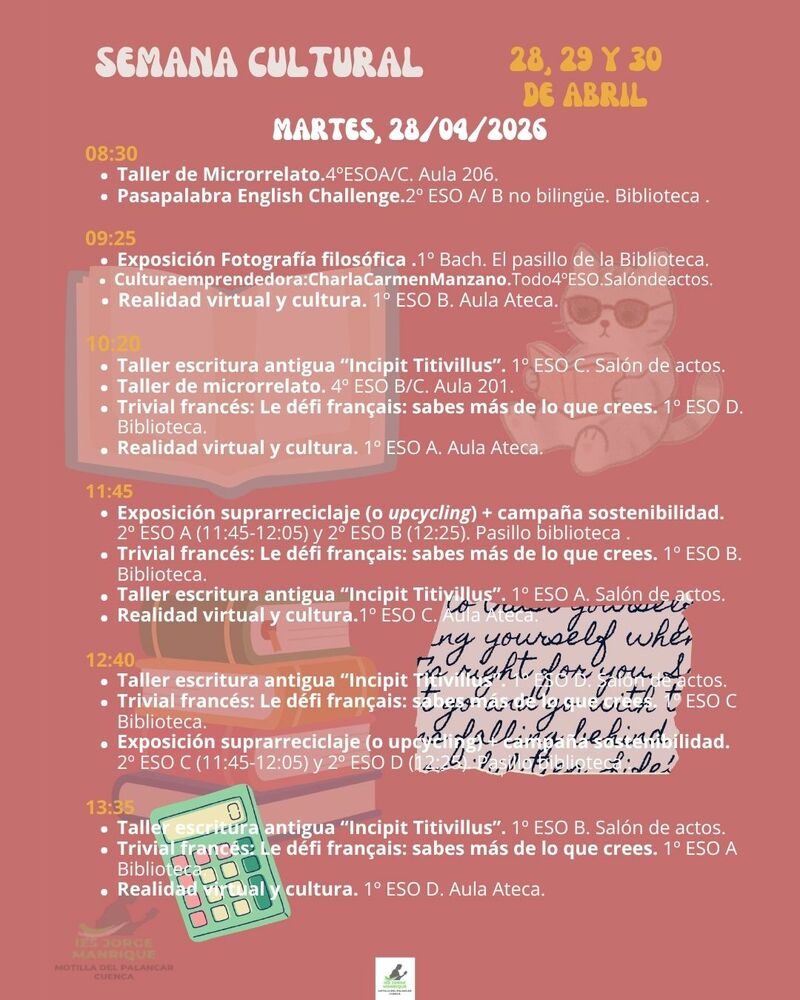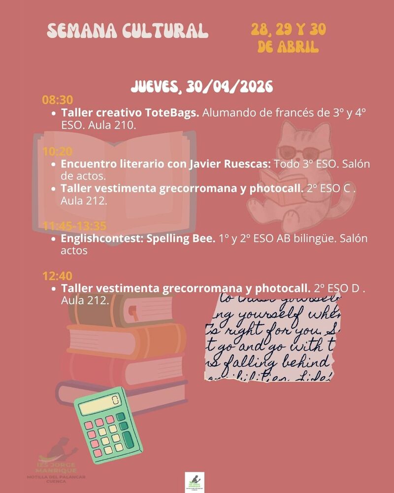 El IES Jorge Manrique de Motilla del Palancar celebrará los días 28, 29 y 30 de abril su esperada Semana Cultural, un evento que reunirá a alumnado y profesorado en torno a la creatividad, la literatura, los idiomas y la innovación.