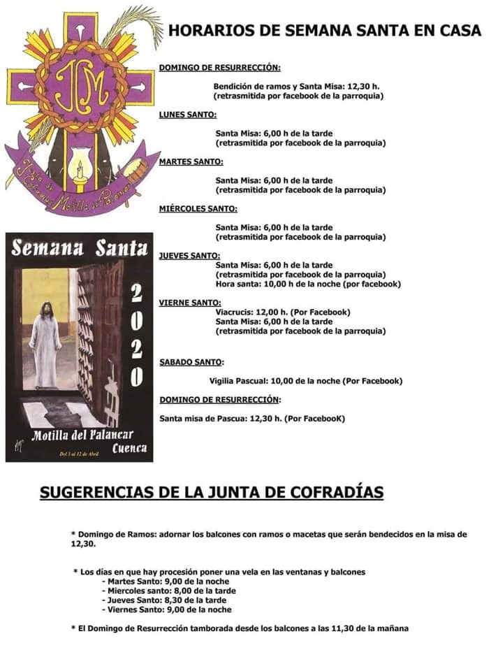 En primer lugar, haceros conocer que las misas serán retransmitidas por el Facebook de la Parroquia de Motilla, podrás encontrar los horarios en la imagen adjunta.