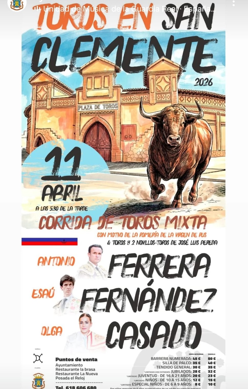 La corrida de toros mixta se celebrará el sábado 11 de abril a las 17:30 horas en la plaza de toros, con la participación de los diestros Antonio Ferrera, Esaú Fernández y Olga Casado, que lidiarán toros y novillos de la ganadería de José Luis Pereda.