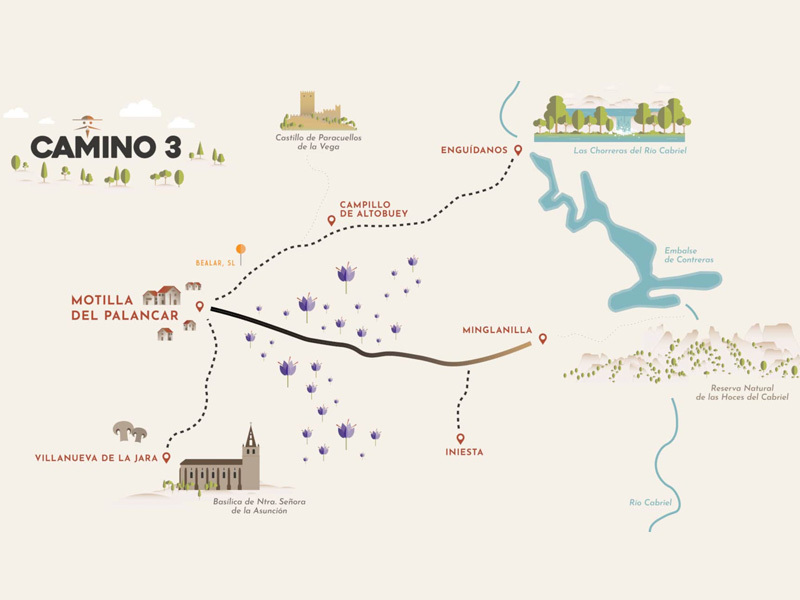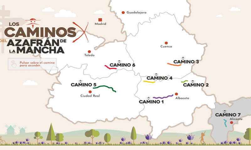El resto de Itinerarios discurren por las zonas en las que se produce y/o se envasa Azafrán de La Mancha como son, Lezuza, Balazote o Munera (Camino 1), Jorquera, Alcalá del Júcar y Casas Ibáñez (Camino 2), Motilla del Palancar (Camino 3), Villarrobledo y Minaya (Camino 4), Carrión de Calatrava, Manzanares o La Solana (Camino 5), Madridejos, Camuñas, Villafranca de los Caballeros, Alcázar de San Juan y Herencia (Camino 6) y Novelda (Camino 7).