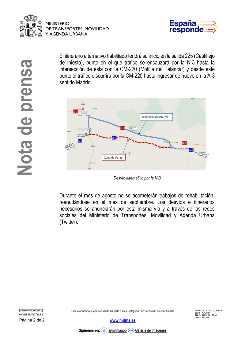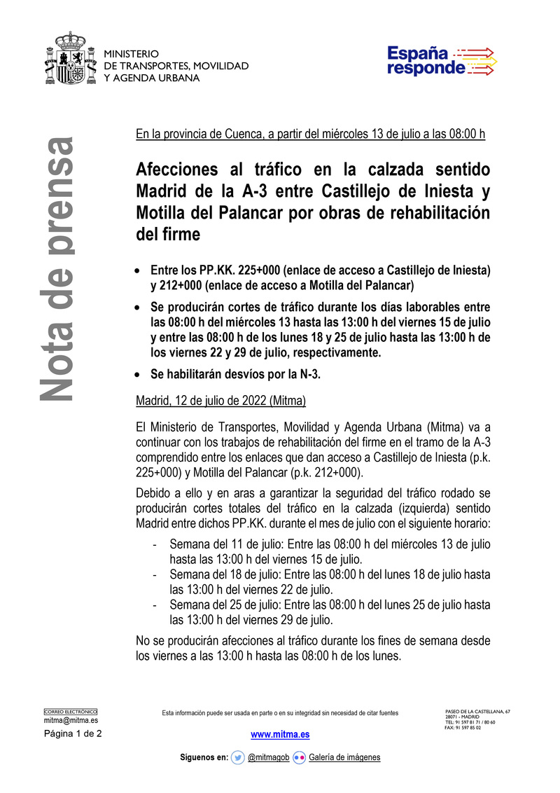 El Ministerio de Transportes, Movilidad y Agenda Urbana (Mitma) va a continuar con los trabajos de rehabilitación del firme en el tramo de la A-3 comprendido entre los enlaces que dan acceso a Castillejo de Iniesta (p.k. 225+000) y Motilla del Palancar (p.k. 212+000).