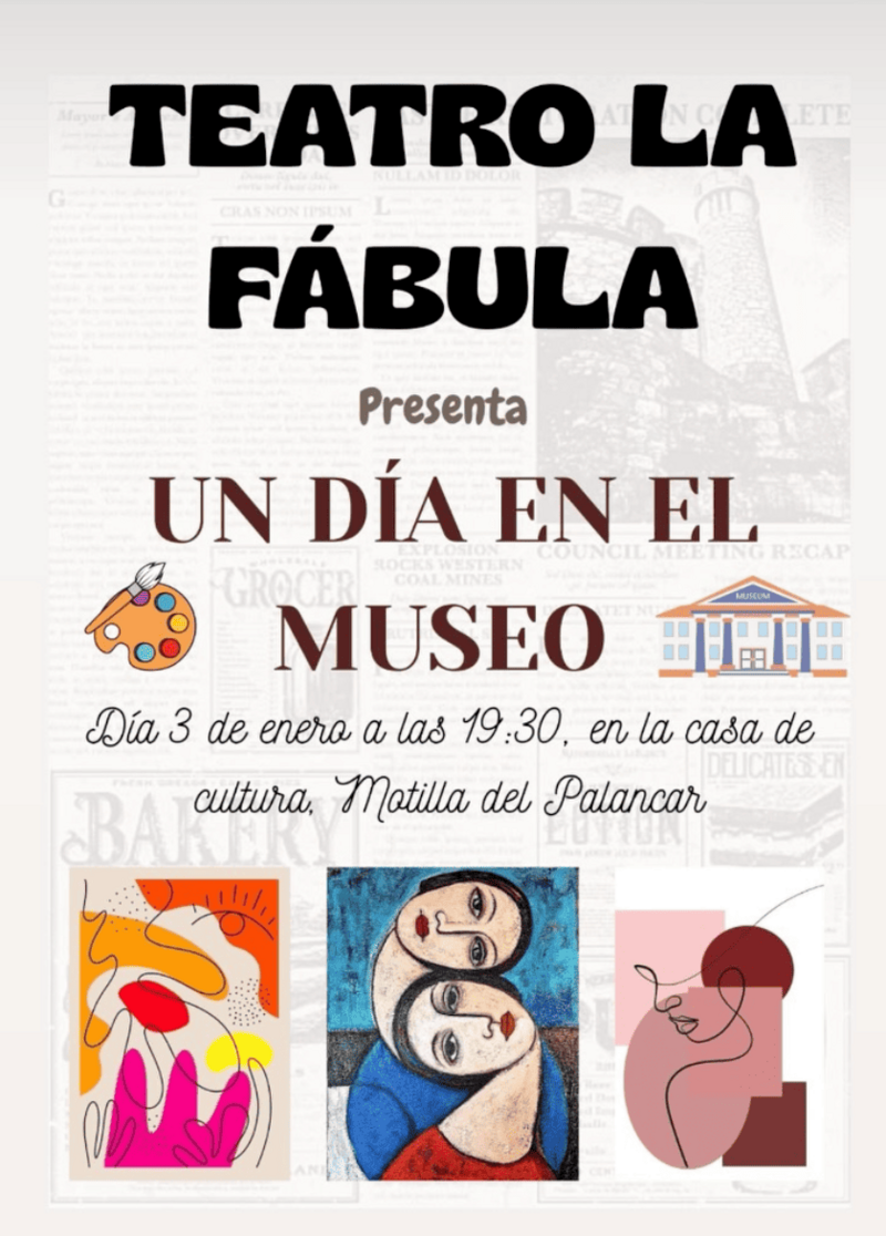 La programación cultural de comienzos de año en Motilla del Palancar contará con una nueva cita teatral. La compañía Teatro La Fábula representará la obra “Un día en el museo”, un montaje que tendrá lugar el viernes 3 de enero a las 19:30 horas en la Casa de Cultura.