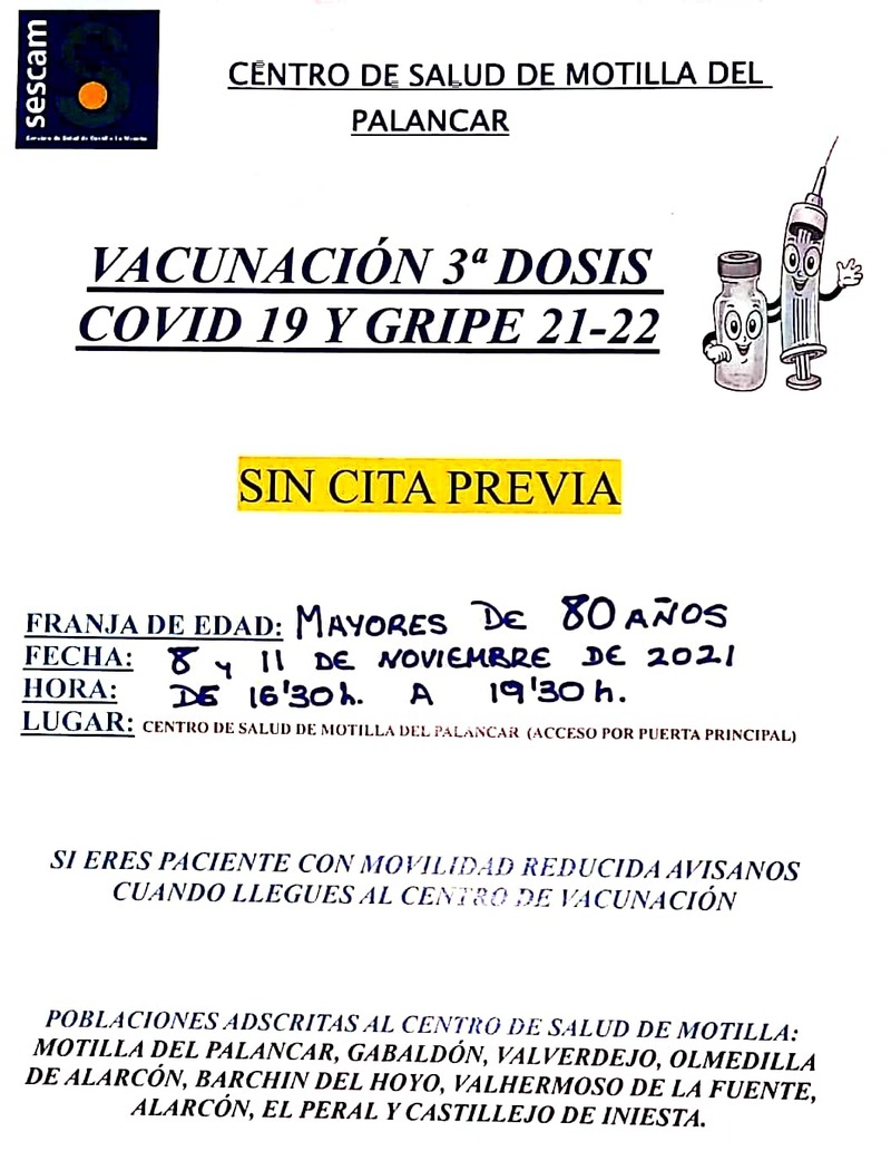 El Centro de Salud de Motilla del Palancar ha realizado una comunicación relacionada con la campaña de vacunación de la gripe 2021-2022, y la tercera dosis de vacuna contra el covid19 que serán suministradas a todos los mayores de 80 años que pertenecen a la zona básica de salud de Motilla.