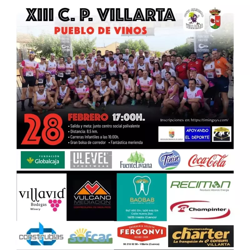 Villarta celebrará el próximo 28 de febrero la decimotercera edición de su Carrera Popular “Pueblo de Vinos”, una cita ya consolidada dentro del calendario deportivo local y comarcal. La prueba, organizada por el Club de Atletismo Villarta, dará comienzo a las 17:00 horas, con salida y meta situadas junto al centro social polivalente.