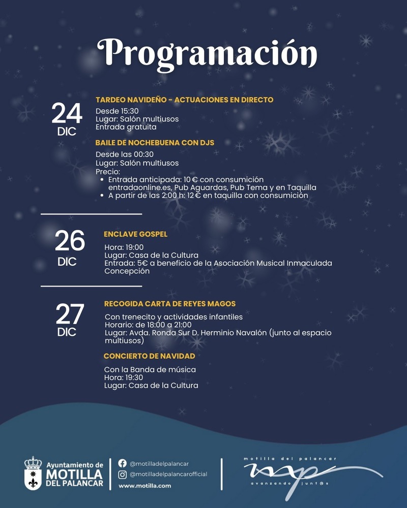La Navidad 2025-2026 en Motilla del Palancar llega con una programación amplia y variada que se desarrollará del 5 de diciembre al 5 de enero. Actividades infantiles, espectáculos, eventos culturales, actuaciones musicales, talleres y las tradicionales celebraciones de Nochebuena, Nochevieja y Reyes conforman una agenda pensada para todas las edades.