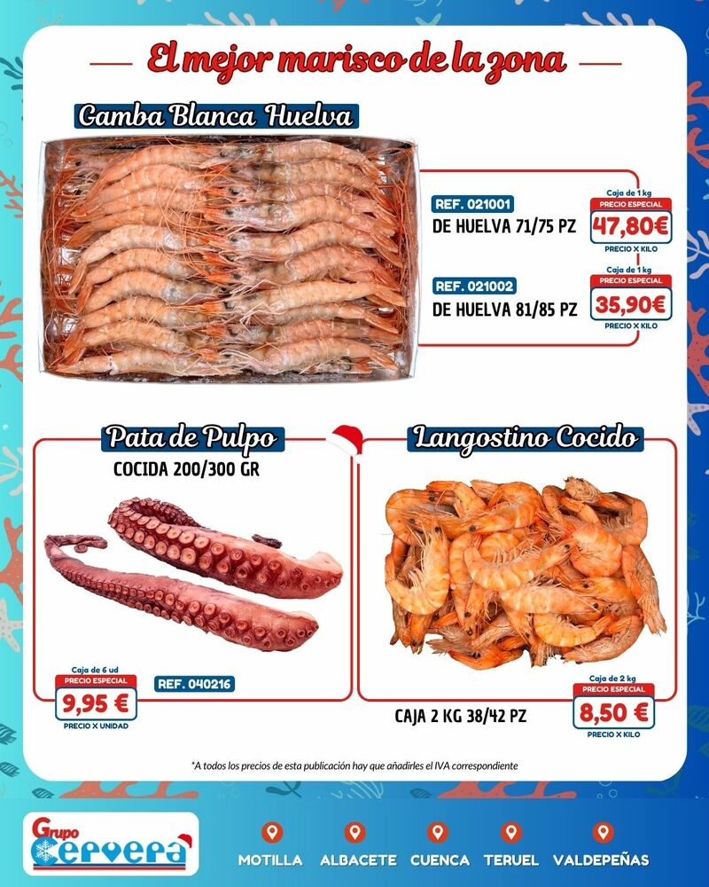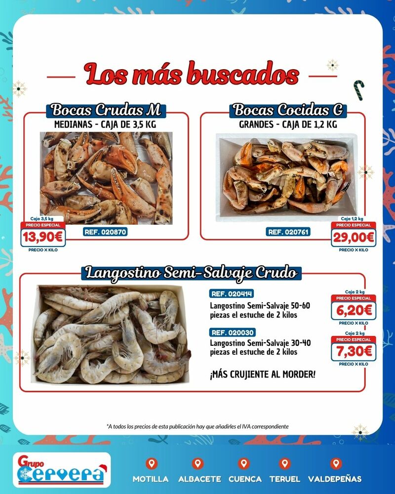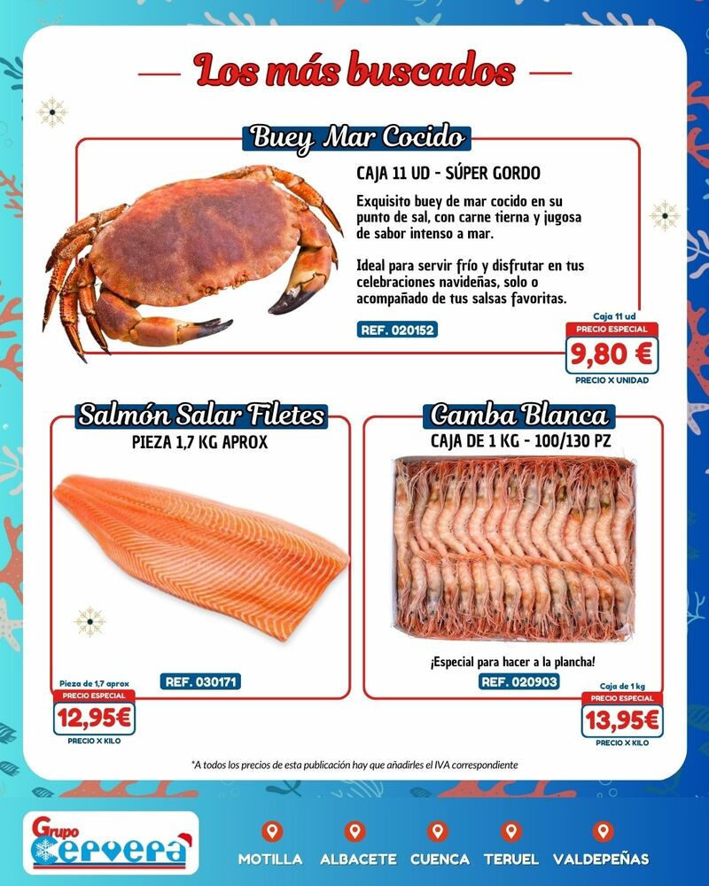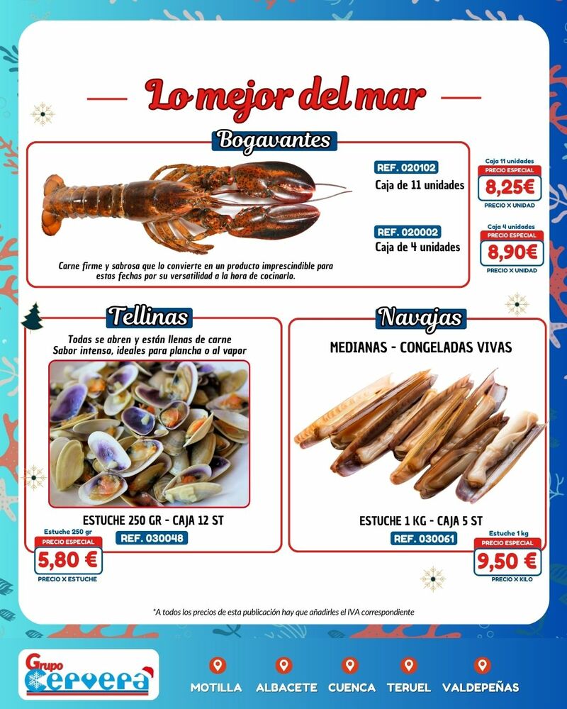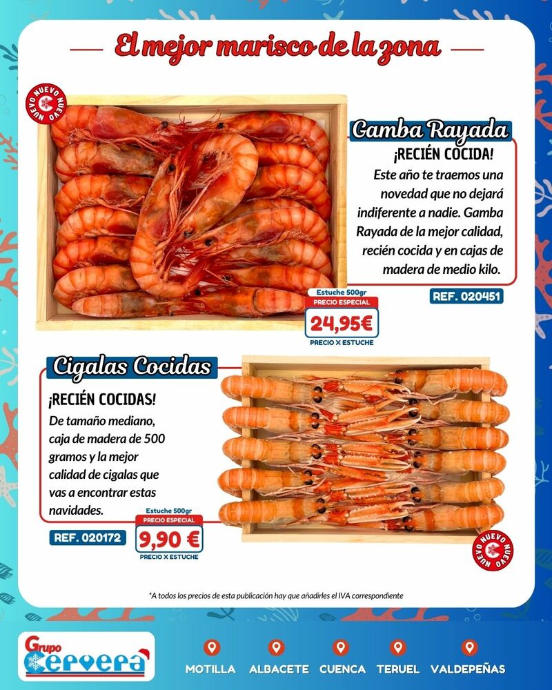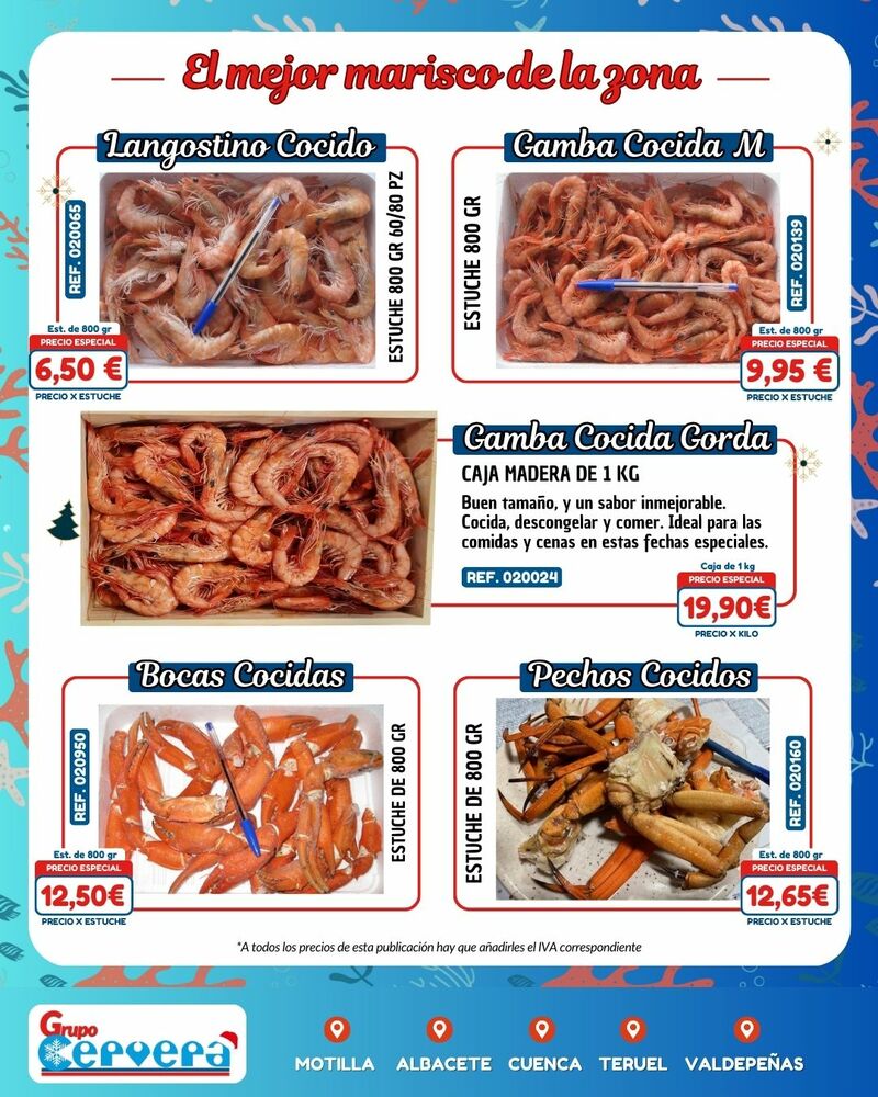 Grupo Cervera lanza su catálogo especial de Navidad con una amplia variedad de mariscos, pescados, carnes, precocinados y productos gourmet a precios competitivos. La empresa, con sede Motilla, Albacete, Cuenca, Teruel y Valdepeñas, anima a adelantar las compras para evitar subidas de precios y asegurar disponibilidad en unas fechas clave para la hostelería y las familias de la provincia.