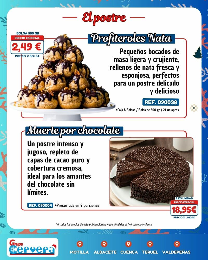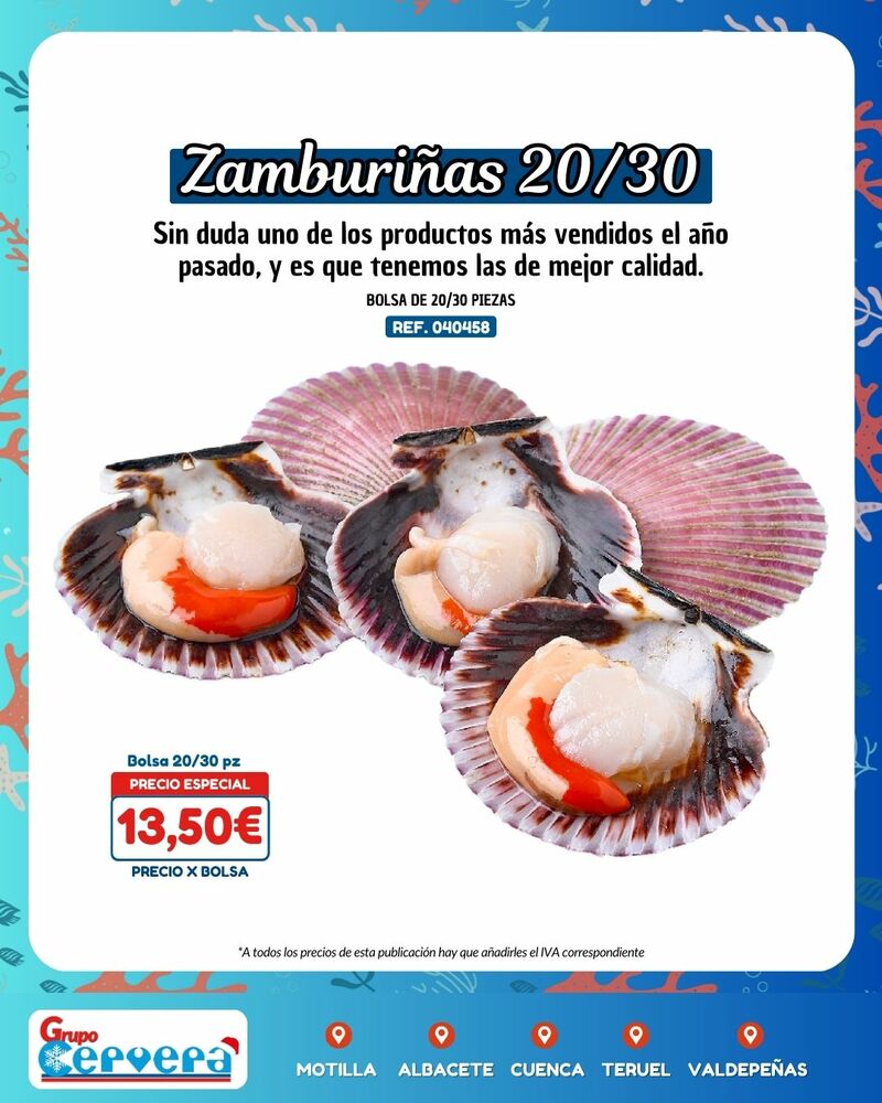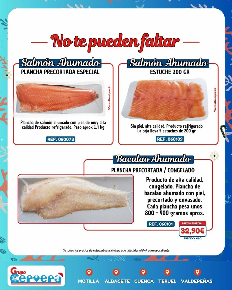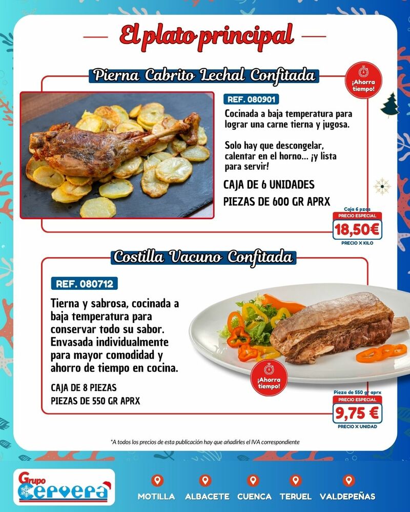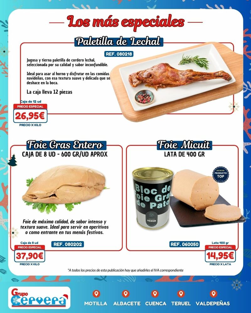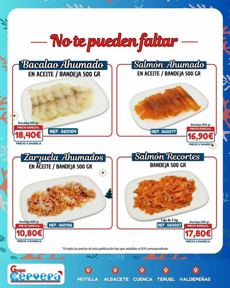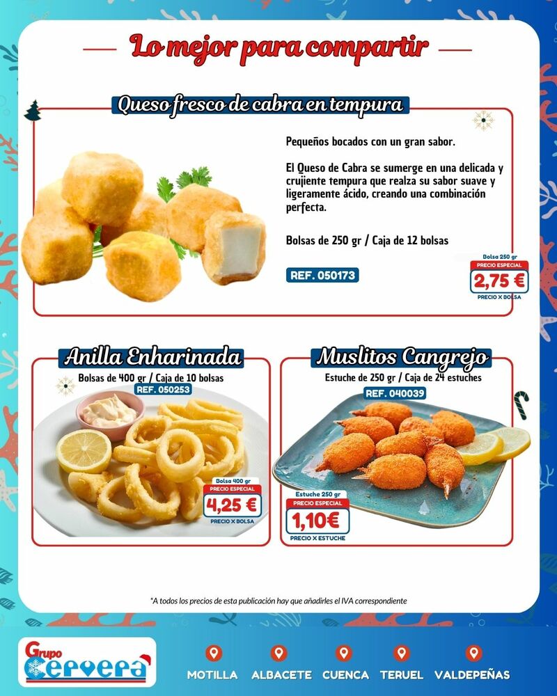 Grupo Cervera lanza su catálogo especial de Navidad con una amplia variedad de mariscos, pescados, carnes, precocinados y productos gourmet a precios competitivos. La empresa, con sede Motilla, Albacete, Cuenca, Teruel y Valdepeñas, anima a adelantar las compras para evitar subidas de precios y asegurar disponibilidad en unas fechas clave para la hostelería y las familias de la provincia.