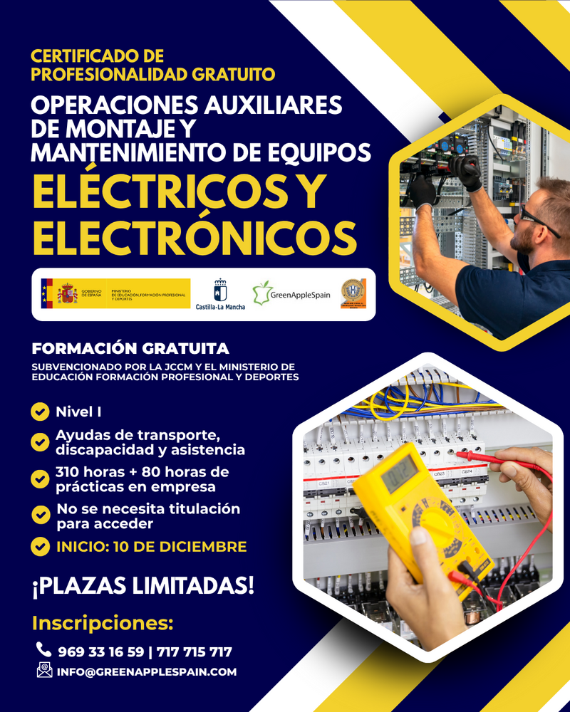 Green Apple Spain ha anunciado la apertura de inscripciones para el curso de Operaciones Auxiliares de Montaje y Mantenimiento de Equipos Eléctricos y Electrónicos, una formación gratuita subvencionada por la Junta de Comunidades de Castilla-La Mancha y el Ministerio de Educación, Formación Profesional y Deportes.